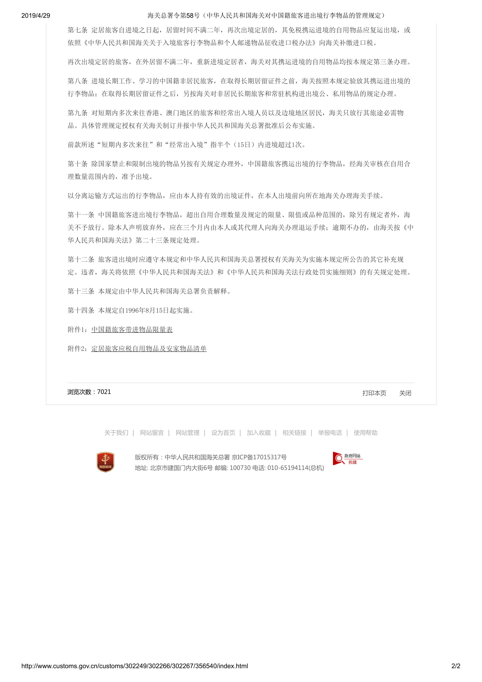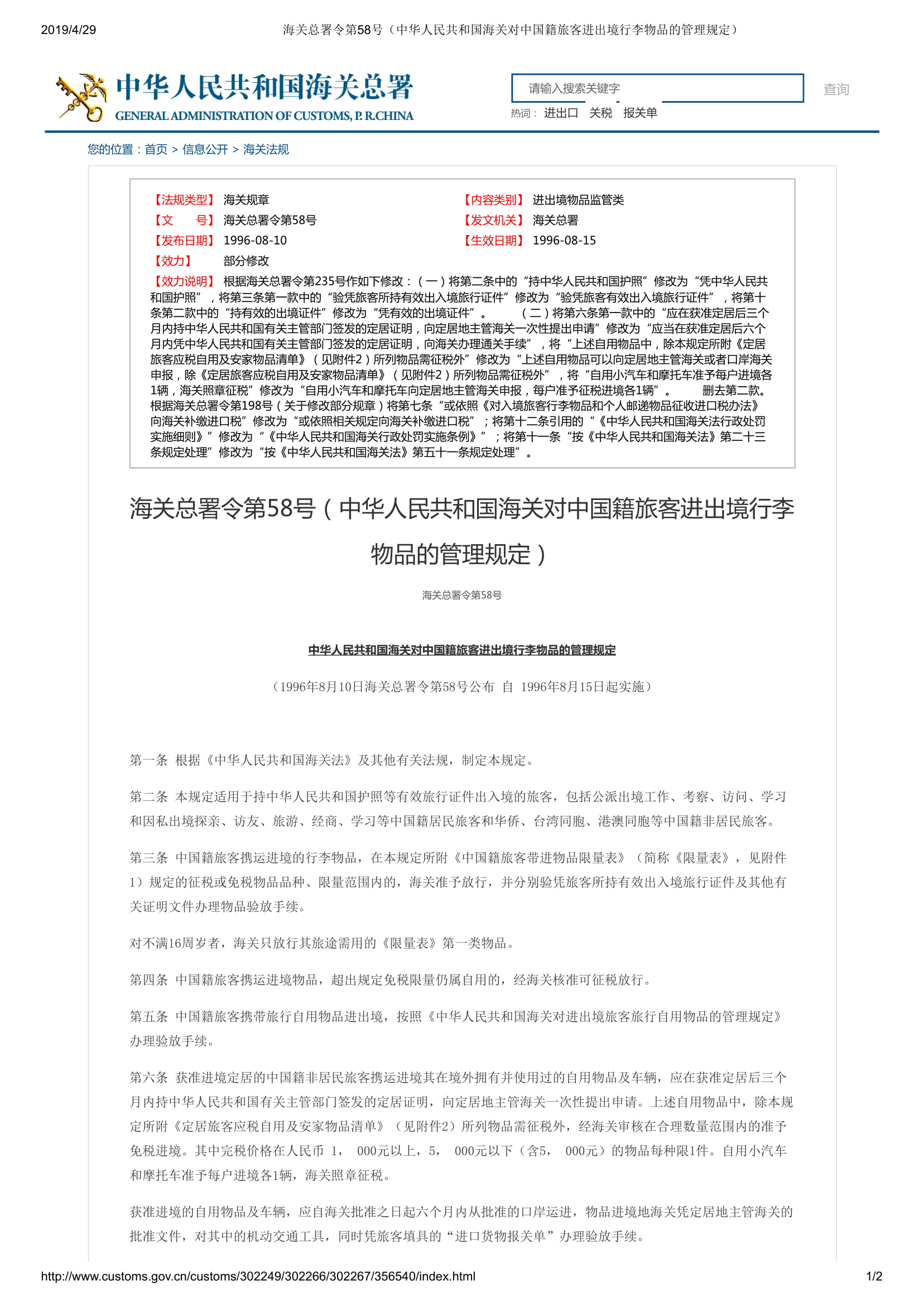 中华人民共和国海关对中国籍旅客进出境行李物品的管理规定